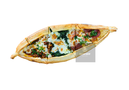 Pide z wołowiną i baraniną z dodatkiem papryki, pomidorów, cebuli i aromatycznych tureckich przypraw oraz sera